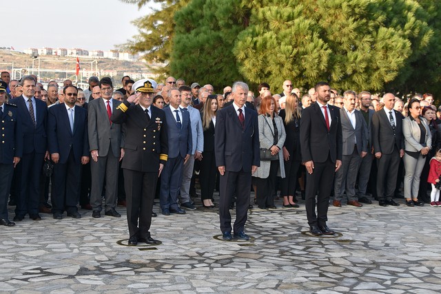 Saat 08.45’de başlayan törende Cumhuriyet Meydanı’ndaki Atatürk Anıtına, Foça Kaymakamlığı, Foça Garnizon Komutanlığı, Foça Belediye Başkanlığı, Ak Parti Foça İlçe Başkanlığı, Cumhuriyet Halk Partisi Foça İlçe Başkanlığı, İyi Parti Foça İlçe Başkanlığı ve Atatürkçü Düşünce Derneği Foça Şubesi’nin çelenkleri sunuldu. Atatürk’ün manevi huzurundaki iki dakikalık saygı duruşu, siren sesiyle birlikte saat 09.05’de başladı. Sirenin bitişinin ardından İstiklal Marşı’mız söylendi. Şanlı bayrağımız göndere çekildi ve ardından yarıya indirildi.